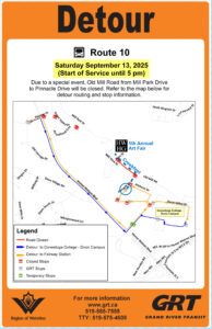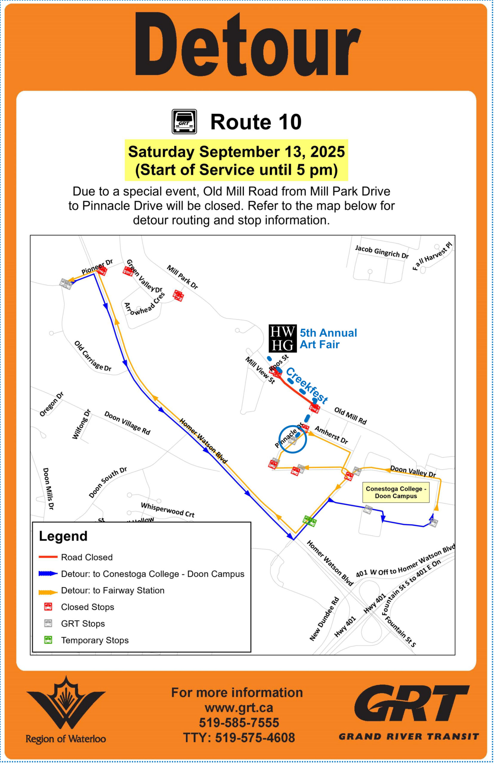 Attendees to Art Fair and CreekFest coming from Fairway Station on the #10 bus will need to stay on the route until after Conestoga College – Doon Campus to reach the bus stop closest to the event, circled in dark blue. If you are ever unsure about your route, talk to your bus driver!