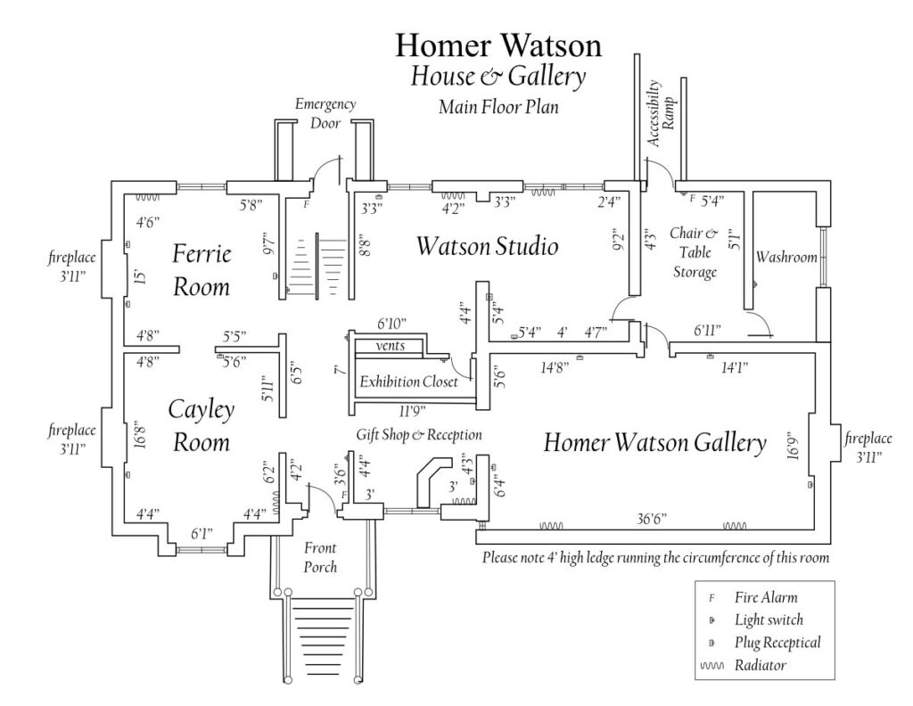 If you haven’t been to the Gallery before, we invite you to view the space and have a discussion with us. The map image on the right shows the sizes of each gallery. The Watson Studio is reserved for our permanent collection and the Ferrie, Cayley, and Homer Watson Galleries are for exhibiting artists to showcase their works.