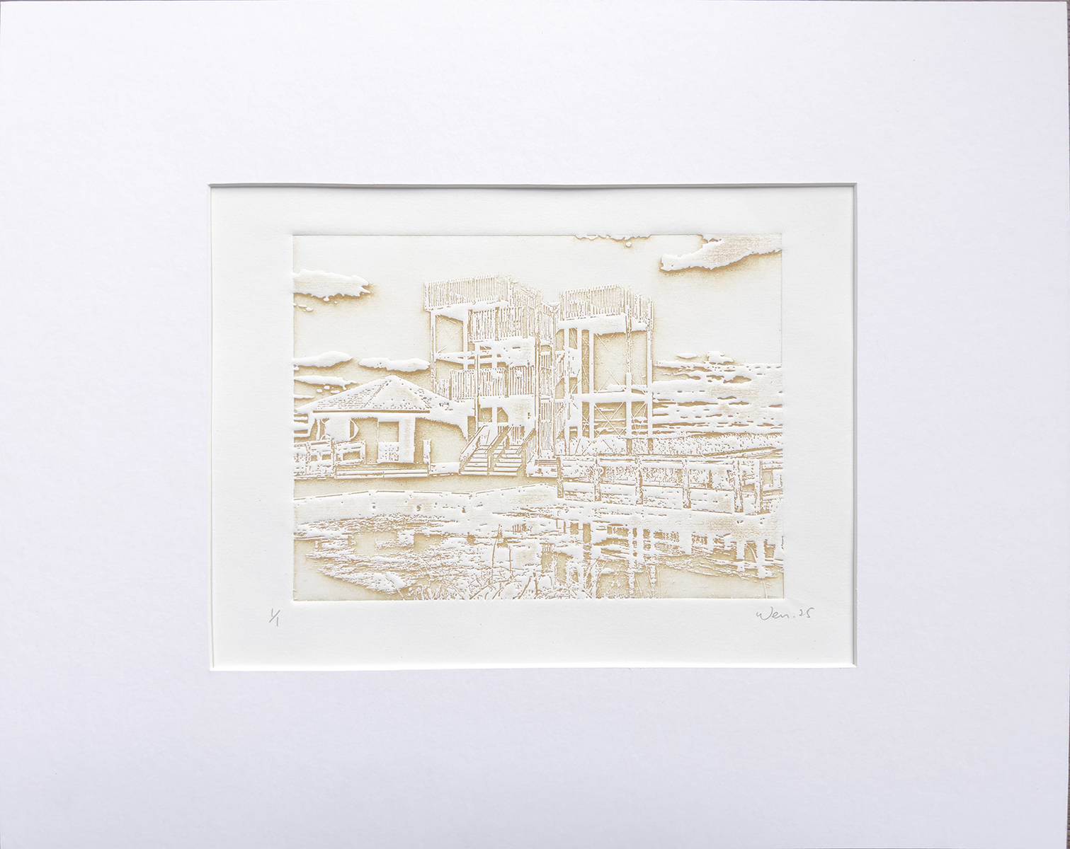 This series includes distinguished embossment prints both blind and tinted with wood burning residues from the laser etching process. The residues are gradually reduced during the process; hence each tinted print is unique and non-repeatable with different colour intensity and contrast.